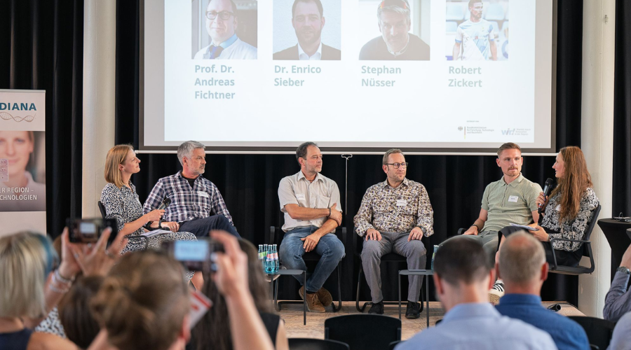 Am 27. August 2025 fand das 4. DIANA-Forum unter dem Titel „Einsatzbereit in Sekunden POCT als Schlüsseltechnologie unter Extrembedingungen“ in der beeindruckenden Eventlocation „Die Fabrik“ in Chemnitz statt. Im Fokus standen praxisnahe Einsatzszenarien von Point-of-Care-Technologien – vom Leistungssport über Rettungseinsätze und Notfallmedizin bis hin zur Nutztierdiagnostik. Das Forum brachte Expert:innen aus Medizin, Sportwissenschaft, Landwirtschaft, Technik, Forschung und Wirtschaft zusammen und spannte damit einen interdisziplinären Bogen, der die Stärke des DIANA-Bündnisses deutlich zeigte: Diagnostik dorthin zu bringen, wo sie gebraucht wird – schnell, zuverlässig und unter realen Einsatzbedingungen. In Impulsvorträgen und einer Podiumsdiskussion diskutierten u. a. Christopher Pöhlmann (EKF Diagnostics), Robert Zickert (Chemnitzer FC), André Pollmächer (ehem. Hochleistungssportler Leichtathletik), Enrico Sieber, Prof. Dr. Andreas Fichtner (Zeisigwaldkliniken Bethanien) und Stephan Nüsser (SNDC GmbH) über aktuelle Anforderungen und Innovationspotenziale. Dabei wurde sichtbar, wie vielfältig POCT-Anwendungen heute schon sind – von Wearables und Schnelltests bis zu textilintegrierten Sensoren. Zuvor stellten aber mehrere DIANA-Projektteams ihre Entwicklungen in einer Begleitausstellung vor und zeigten eindrucksvoll, wie nah die laufenden Projekte bereits an realen Anwendungsszenarien ausgerichtet sind. Das Forum markierte gleichzeitig die Halbzeit der aktuellen Förderphase. In einer Zwischenbilanz wurden Fortschritte, Bedarfe und neue Transferperspektiven zur weiteren Stärkung der regionalen Innovationskraft diskutiert.